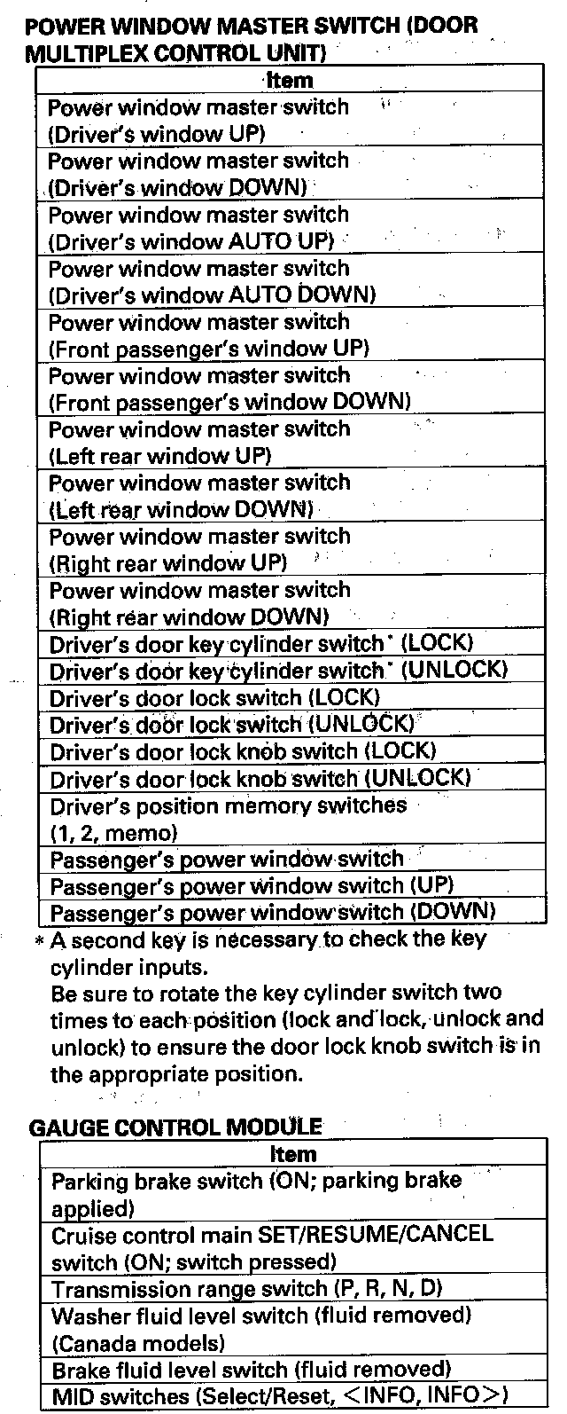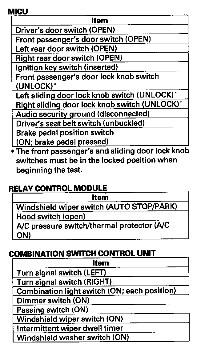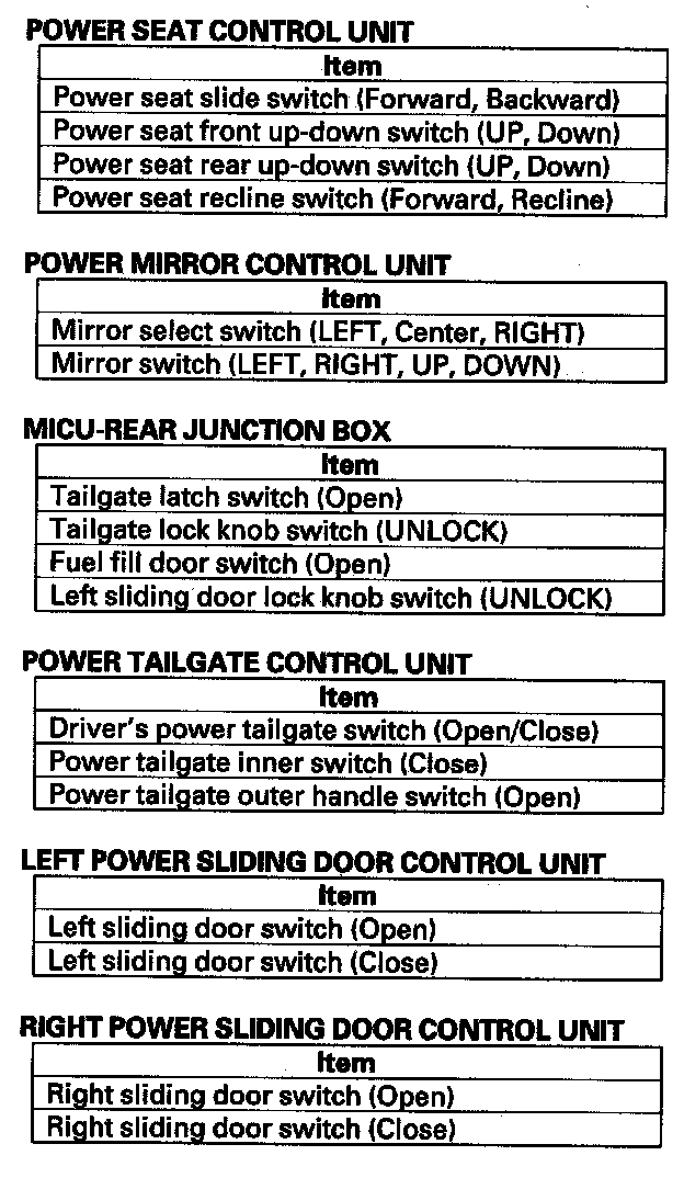 11. The following tables list the circuits that can be checked in Test Mode 2. Operate the switch that is most closely related to the problem. If the circuit is OK, the map lights will blink once. If the circuit is faulty, there will be no indication.