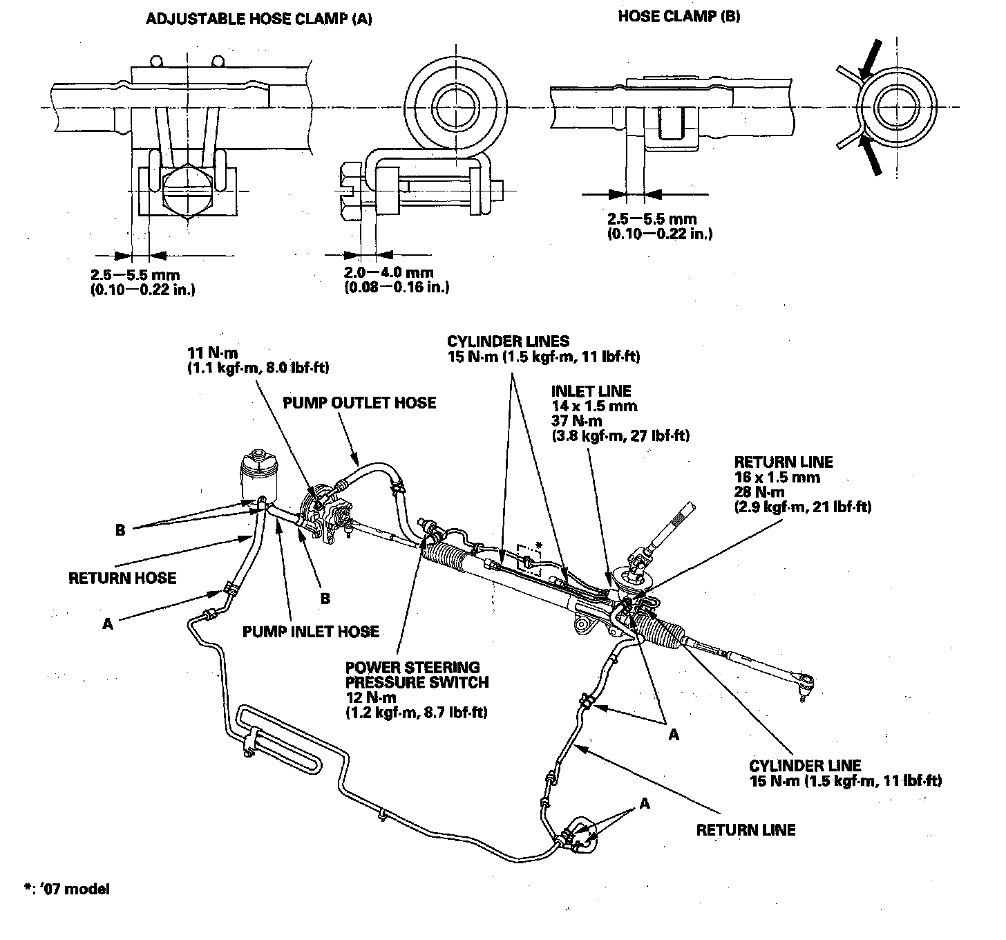 ^ Connect each hose to the corresponding line securely until it contacts the stop on the line. Install the clamp or adjustable clamp at the specified distance from the hose end as shown.