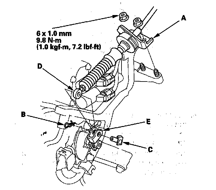 7. Remove the spring clip (B) and the control pin (C), then separate the shift cable end (D) from the control lever (E).