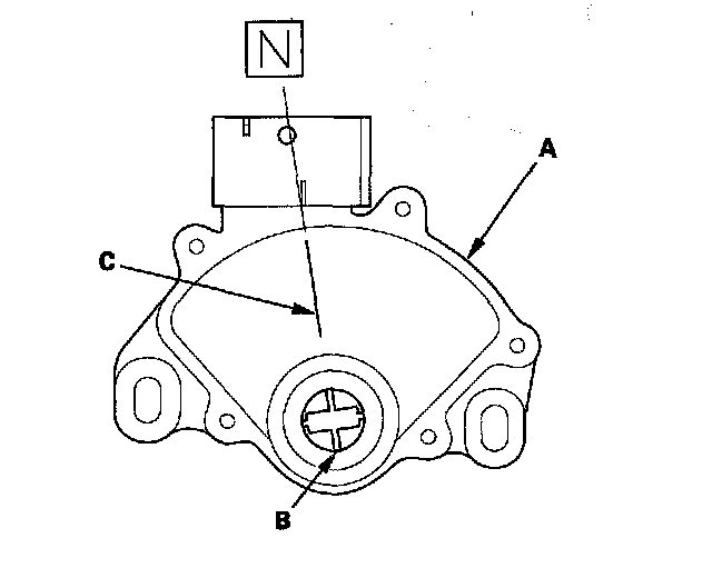 12. Set a new transmission range switch (A) to the N position. The transmission range switch clicks in the N position, and the selector control shaft hole (B) aligns with the N position line (C).