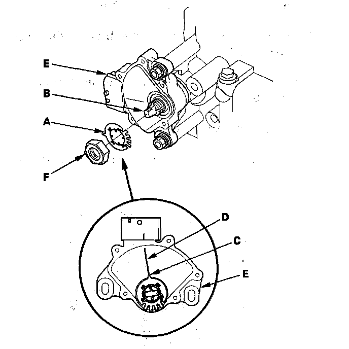 15. Install a new lock washer (A) over the selector control shaft (B) while aligning the tab (C) of the lock washer with the N positioning line (D) on the transmission range switch (E), and install the locknut (F).