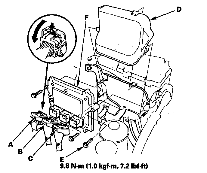 11. Loosen or remove the bolts (E), then remove the PCM (F).