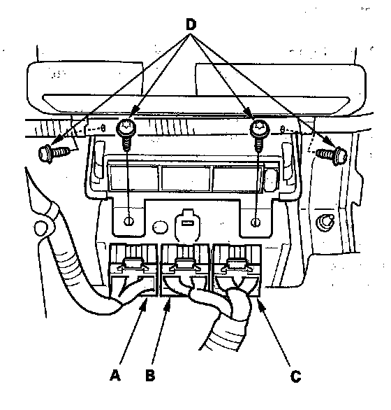 7. Disconnect the SRS unit connector A (28P), SRS unit connector B (28P), SRS unit connector C (16P), and remove the TORX bolts (D), then pull out the SRS unit.