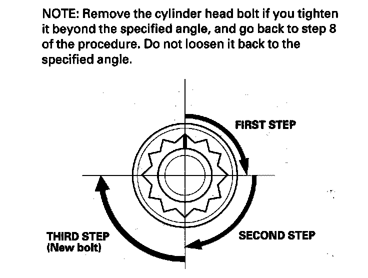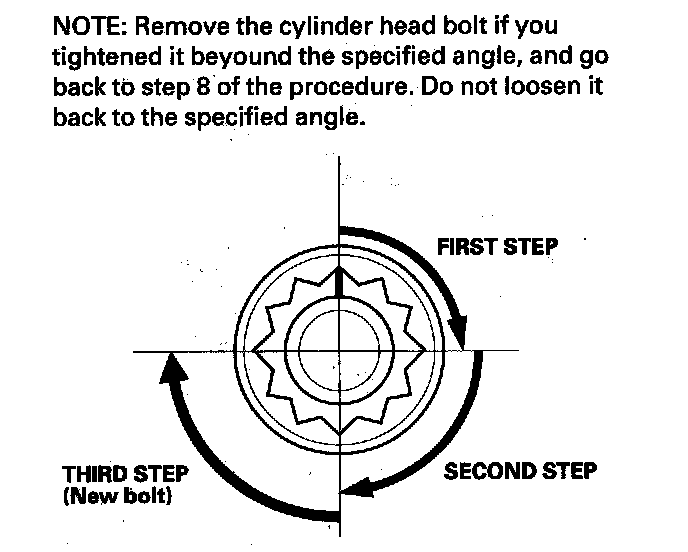 After torquing, tighten all cylinder head bolts in two steps (90° per step). If you are using a new cylinder head bolt, tighten the bolt an extra 90°.