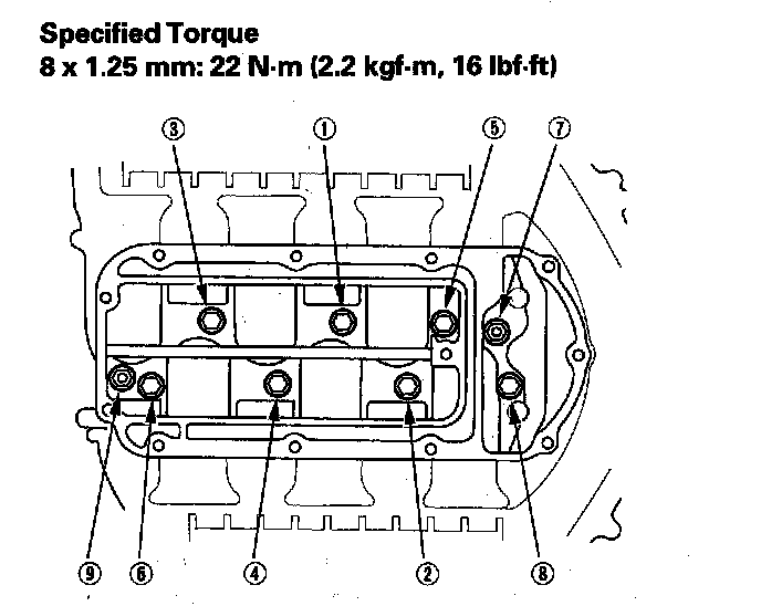 Tighten the bearing cap bolts, and then the bearing cap side bolts, in the sequence as shown. Repeat the torque sequence again to ensure the bolts are properly torqued.