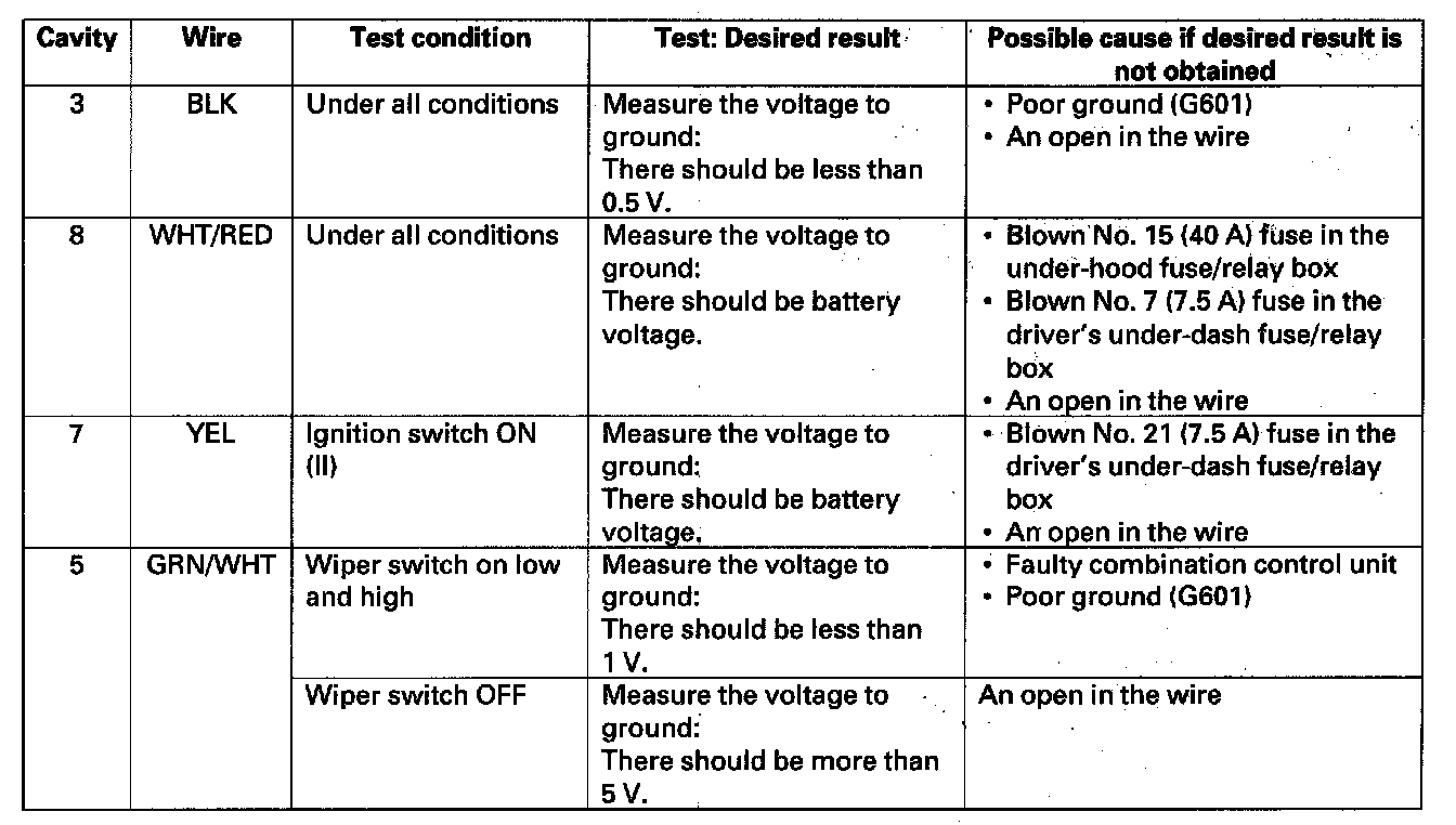Wiper/Washer Switch (Combination Switch Control Unit) Input Test1. Before troubleshooting the wiper/washer system, troubleshoot the B-CAN System Diagnosis Test Mode A.