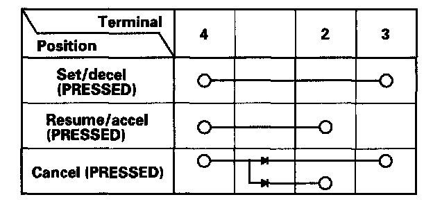 - If there is continuity, and it matches the table, but switch failure occurred on the cruise control input test, check and repair the wire harness on this switch circuit.