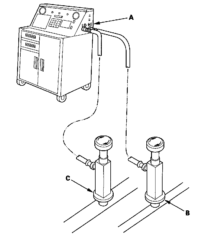 1. Connect an R-134a refrigerant recovery/recycling/charging station (A) to the high-pressure service port (B) and the low-pressure service port (C), as shown, following the equipment manufacturer's instructions.