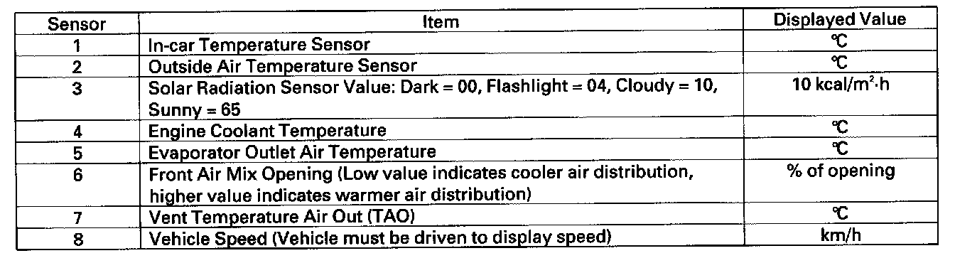 Displaying Sensor Inputs at the Climate Control UnitThe climate control unit has a mode that displays sensor inputs it receives. This mode shows you what the climate control unit is receiving from each of the sensors, one at a time, and it can help you determine if a sensor is faulty.