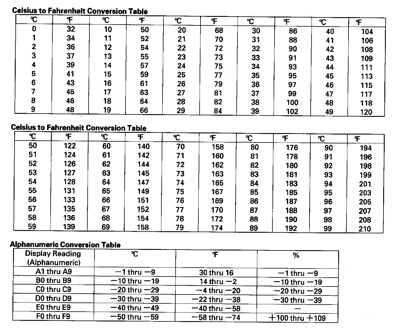 - The sensor values will be displayed in degrees Celsius (°C) or an alphanumeric code. Use the chart to convert the value to degrees Fahrenheit (°F).