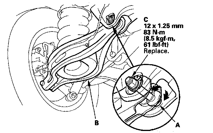 3. Hold the adjusting bolt (A) on the rear lower arm B, and loosen the self-locking nut (C).