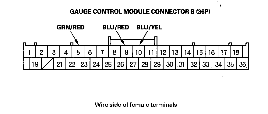1. Remove the gauge control module and disconnect 36P connector B from the gauge control module.