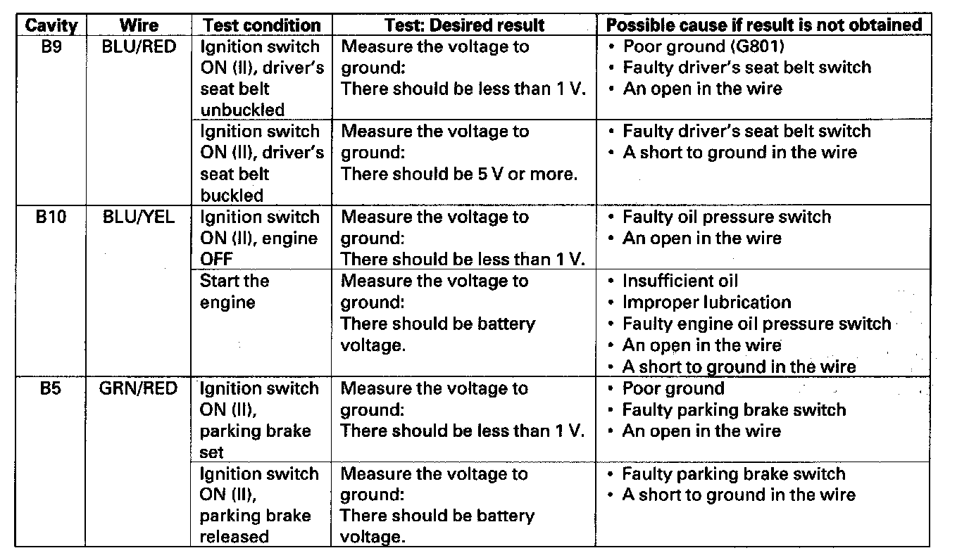 Gauge Control Module Input TestNOTE: If there is malfunction of the parking brake reminder and speedometer function simultaneously, troubleshooting the vehicle speed signal circuit first.