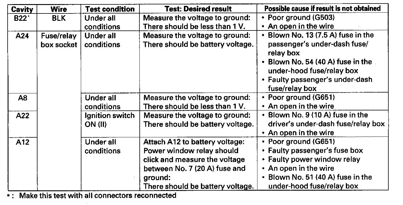 3. Make the following input tests at connector B (22P) and passenger's under-dash fuse/relay box socket connector A. Be careful not to spread the fuse box connectors.