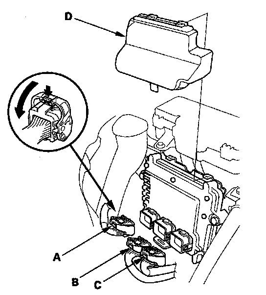 NOTE: PCM connectors A, B, and C have a symbols (A=D, B=A, C=O) embossed on them for identification.