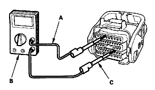 5. Connect one side of the patch cord (A) terminals to a commercially available digital multimeter (B), and connect the other side of the patch cord terminals to a commercially available banana jack (Pomona Electronics Tool No. 3563 or equivalent) (C).