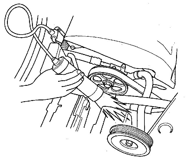 6. Aim the light toward the pointer (A) on the timing belt cover. Check the ignition timing under a no load condition, (headlights, blower fan, rear window defogger, and air conditioner are turned off)