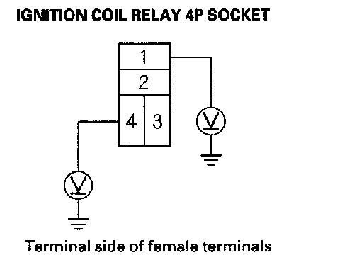 3. Measure the voltage between ignition coil relay 4P socket terminal No. 1 and body ground, then terminal No. 4 and body ground.