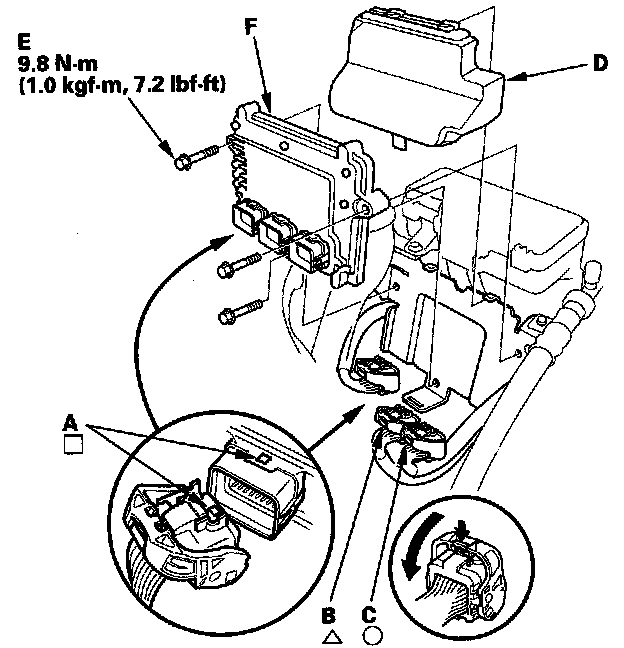 12. Remove the bolts (E), then remove the PCM (F).