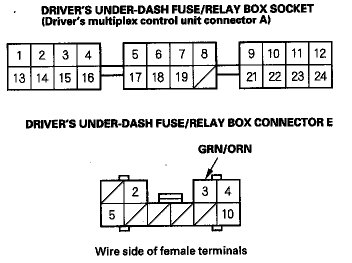 7. With the driver's multiplex control unit still disconnected, make these input tests at the driver's under-dash fuse/relay box socket.
