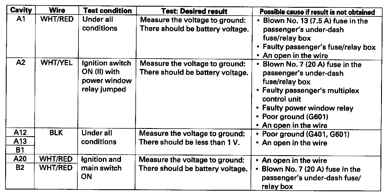 NOTE: For the terminals A4, A5, A10, A11, and A14, refer to the power window control unit input test.