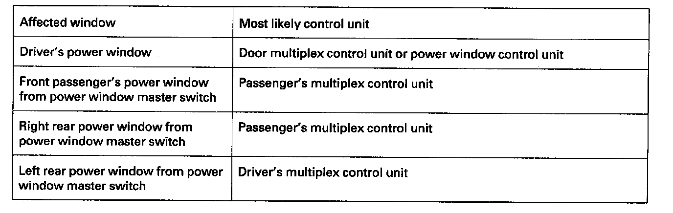 13. If all the input tests prove OK, one of the control units must be faulty. Substitute a known-good control unit for the one that is most likely at fault using the chart below, then check the system. If the system works properly, the original control unit is faulty; replace it. If there is still a malfunction, substitute a known-good control unit for the next most likely unit to be at fault, and recheck. If the system works properly, the original unit is faulty; replace it.