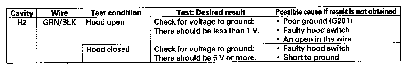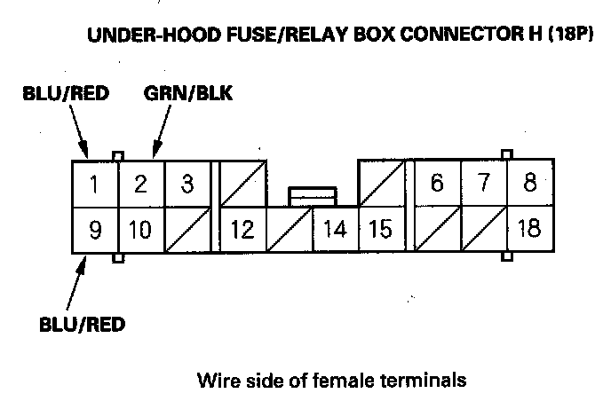 12. Reconnect the connector to the under-hood fuse/relay box, turn the ignition switch ON (II) and make the input test at the appropriate connector on the under-hood fuse/relay box.