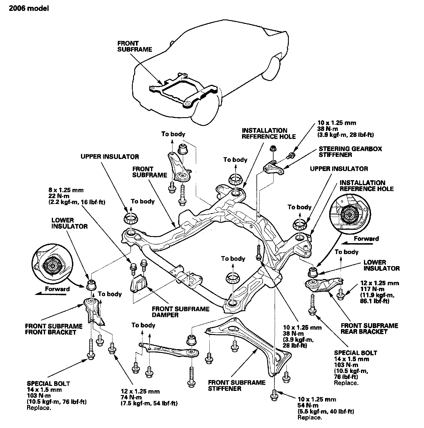- After removing the subframe mounting bolts, be sure to replace them with new ones.