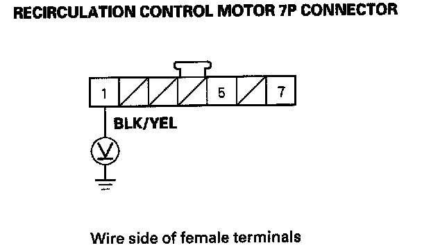 4. Measure the voltage between the recirculation control motor 7P connector No. 1 terminal and body ground.