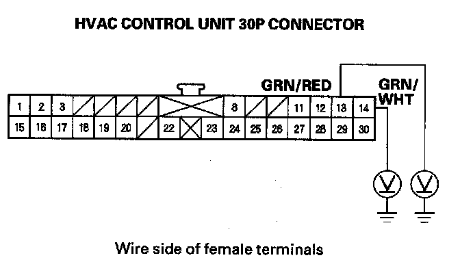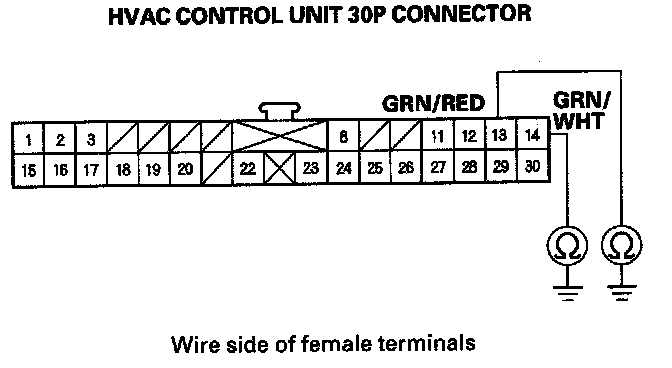 8. Check for continuity between body ground and the HVAC control unit 30P connector No. 13 and No. 14 terminals individually.