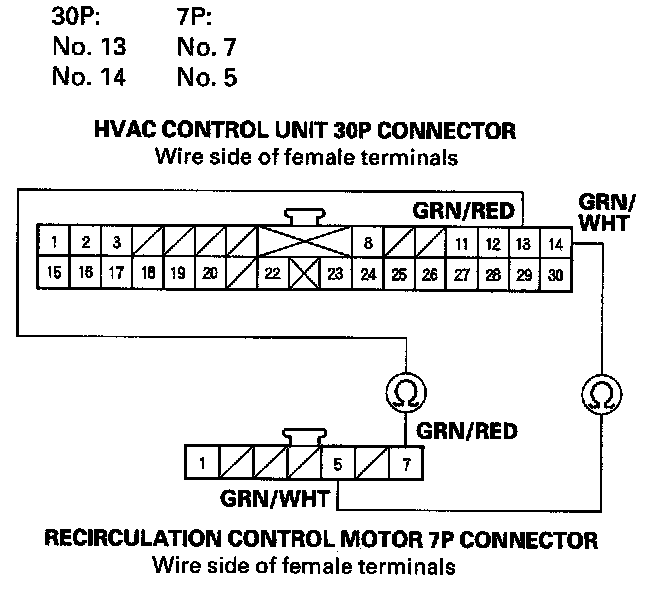 11. Check for continuity between the following terminals of the HVAC control unit 30P connector and the recirculation control motor 7P connector.