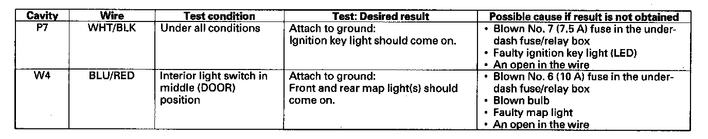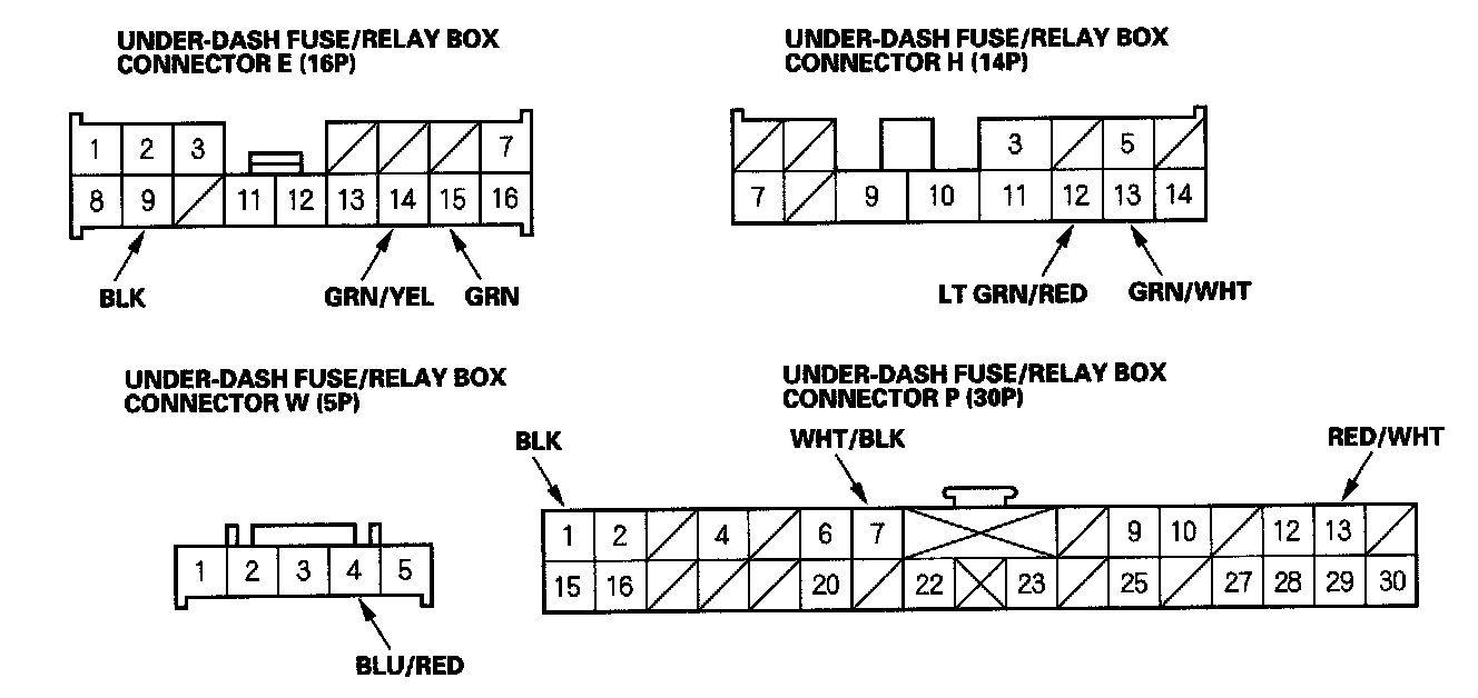 6. Reconnect the connectors to the under-dash fuse/relay box. Turn the ignition switch ON (II), and make these input tests at the appropriate connectors on the under-dash fuse/relay box.