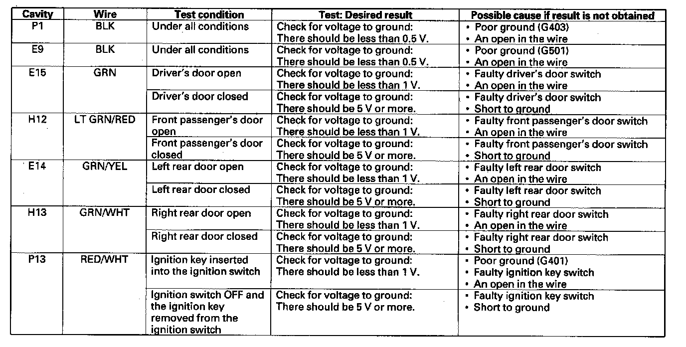 11. Reconnect the connector to the door multiplex control unit. Turn the ignition switch ON (II), and make these input tests at the appropriate connector.