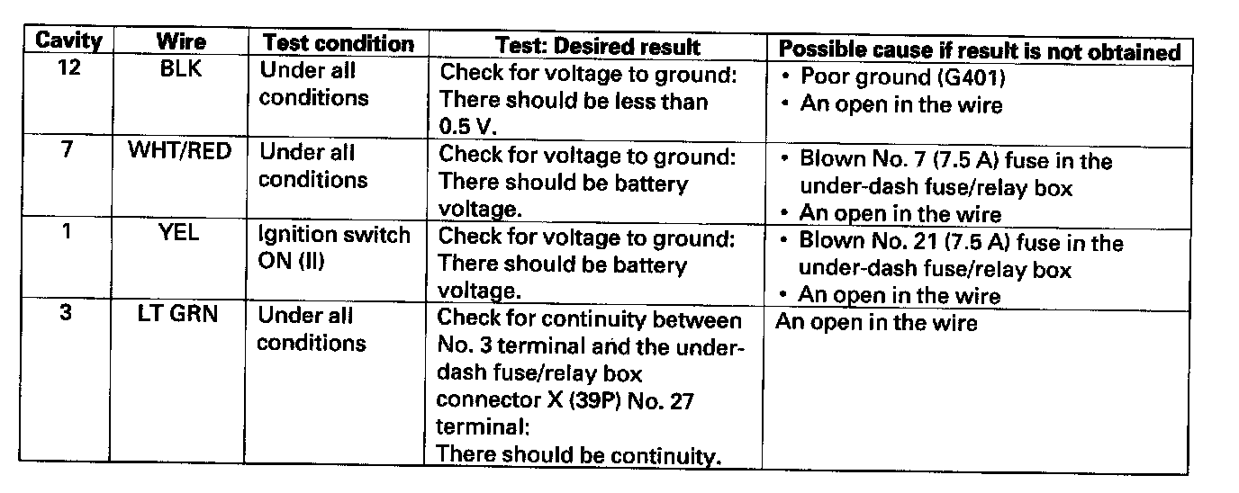 Combination Switch Control Unit Input TestNOTE: Check the No.22 (120 A) No. 23 (50 A), No. 15 (40 A) fuse in the under-hood fuse/relay box before troubleshooting.