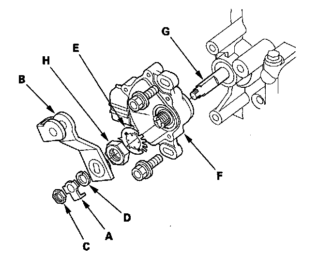 10. Pry the lock tabs of the lock washer (E) on the transmission range switch (F), hold the selector control shaft (G) with a 6.0 mm wrench, and loosen the locknut (H).