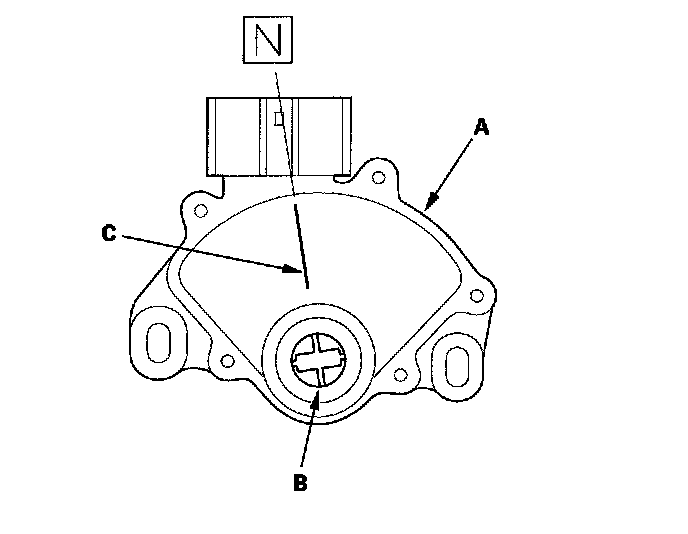 12. Set the new transmission range switch (A) to the N position. The transmission range switch clicks in the N position, and the control shaft hole (B) aligns with the N position line (C).