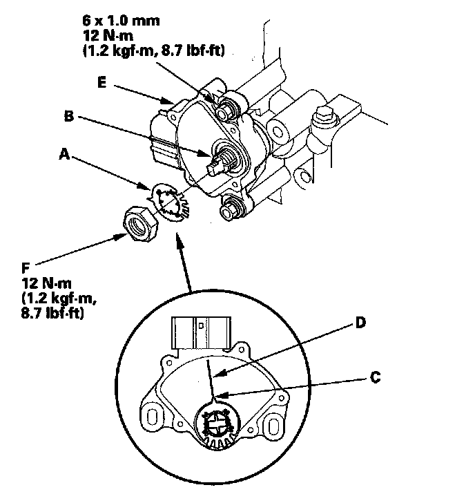 15. Install the new lock washer (A) over the selector control shaft (B) while aligning the projection (C) of the lock washer with the N positioning line (D) on the transmission range switch (E), and install the locknut (F).
