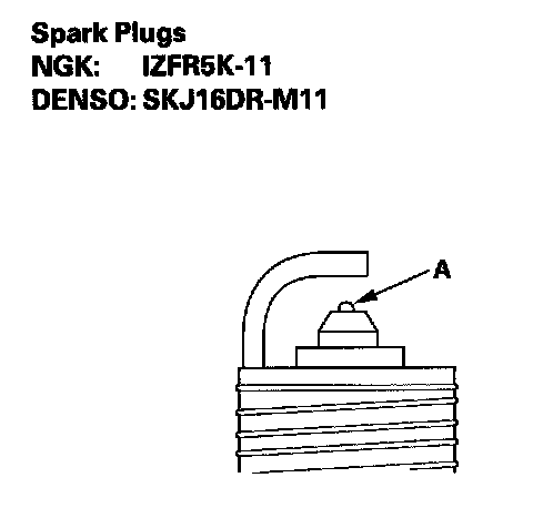 4. Replace the plug at the specified interval, or when the center electrode is rounded (A). Use only the listed spark plugs.