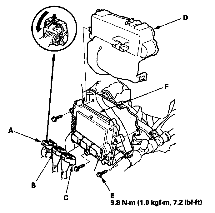 9. Remove the bolts (E), then remove the PCM (F).