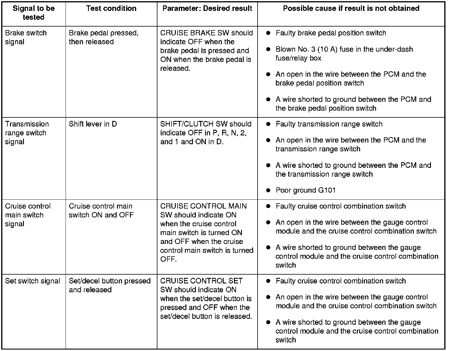 NOTE: Intermittent failures are often caused by loose circuit connections. While monitoring cruise control inputs, flex the circuits, and note if any of the test results change.