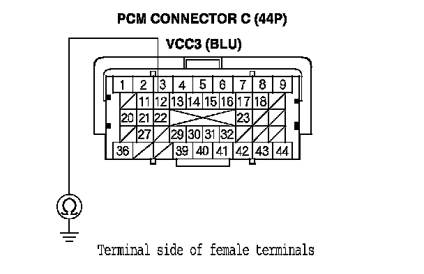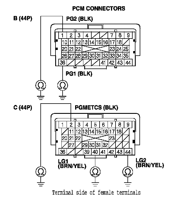 72. Check for continuity between body ground and PCM connector terminals B1, B36, C2, C40, and C44 individually.