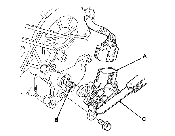 7. Install the transmission range switch (A) gently on the selector control shaft (B) while holding it in the N position with the 2.0 mm (0.08 in.) blade (C).