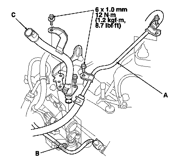12. Remove the harness clamp (B), and remove the ATF dipstick guide tube (C).