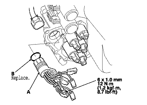 15. Install a new O-ring (B) on the shift solenoid harness connector, and install the connector in the transmission housing.
