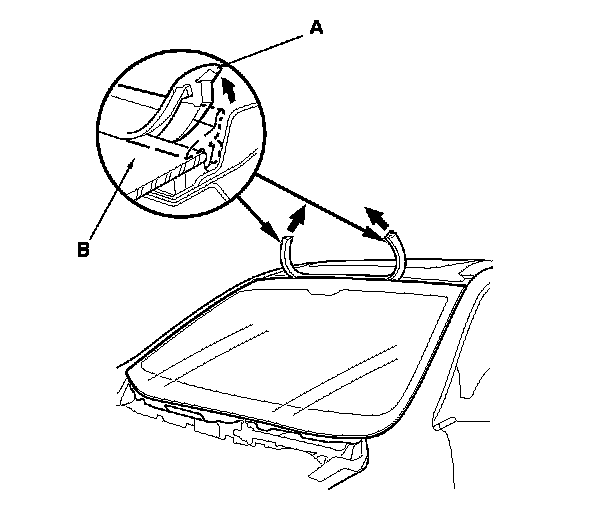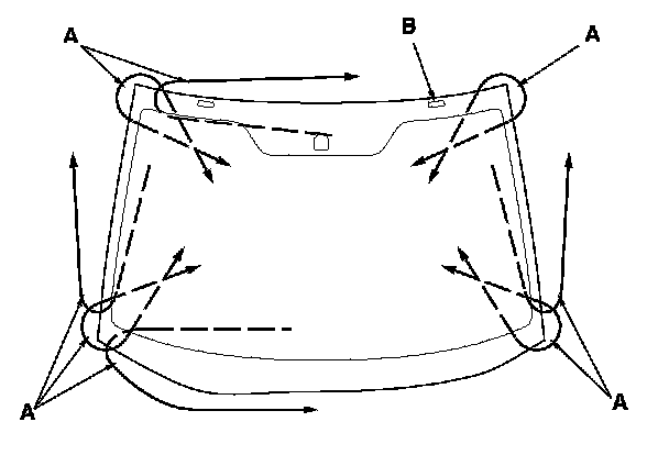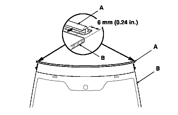 2. Remove the molding (A) from the upper edge of the windshield (B). If necessary, cut the molding with a utility knife.
