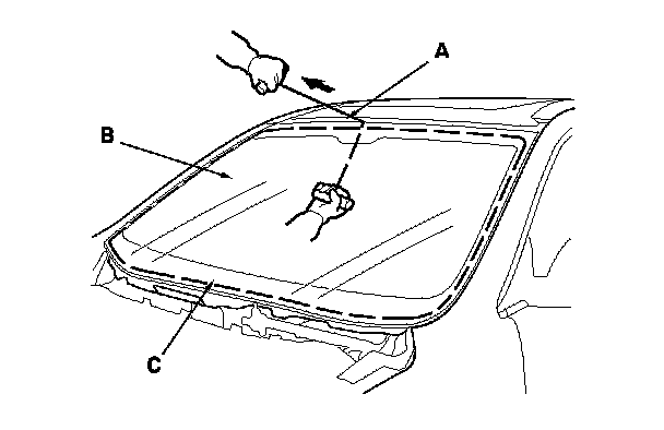 Carefully cut through the rubber dam and the adhesive (C) around the entire windshield.