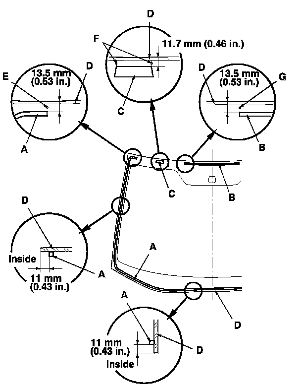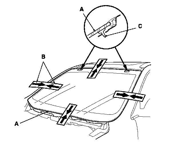 11. Attach the side rubber dam (A), the upper rubber dam (B), and the clips (C) with adhesive tapes to the inside face of the windshield (D) as shown: