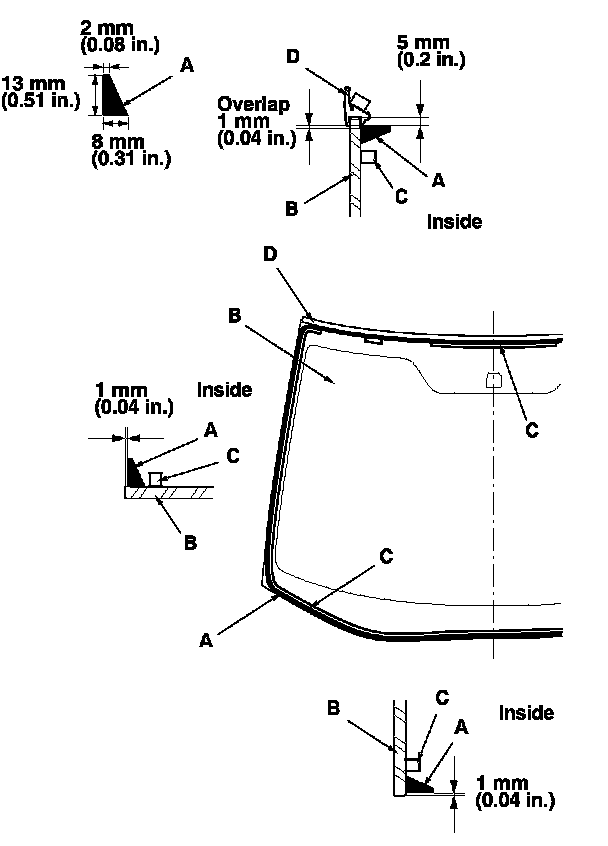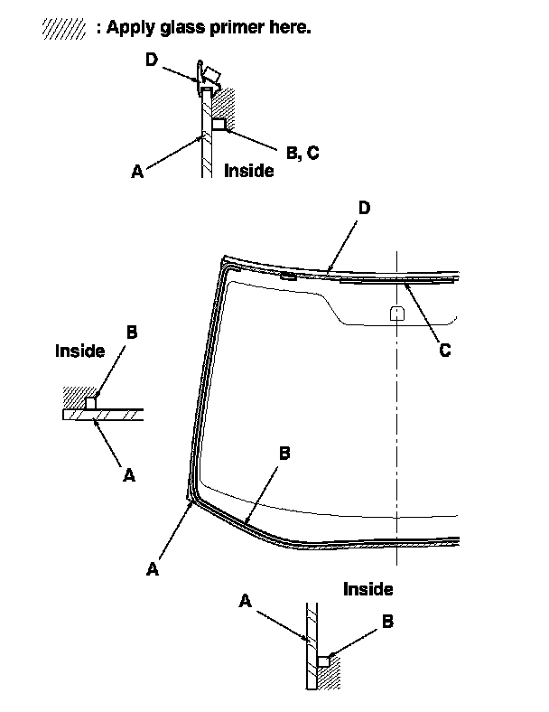 16. With a sponge applicator, apply a light coat of glass primer around the edge of the windshield (A) between the rubber dams (B, C) and the molding (D) as shown, then lightly wipe it off with gauze or cheesecloth: