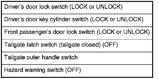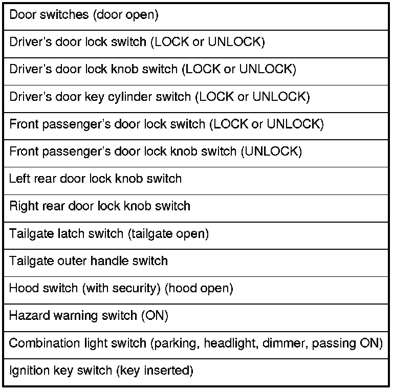 NOTE: If any control unit is faulty and will not wake up, several circuits in the system will malfunction at the same time. In the table below, a list of the switches and input signals that can wake it up.