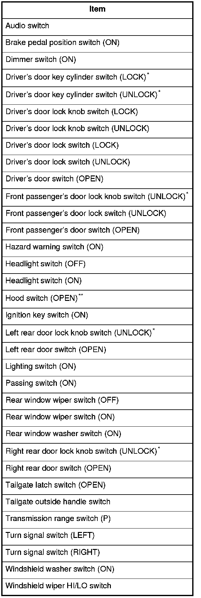 11. The following table lists the circuits that can be checked in Test Mode 2. Operate the switch that is most closely related to the problem. If the circuit is OK, the ceiling light will blink once. If the circuit is faulty, there will be no indication.